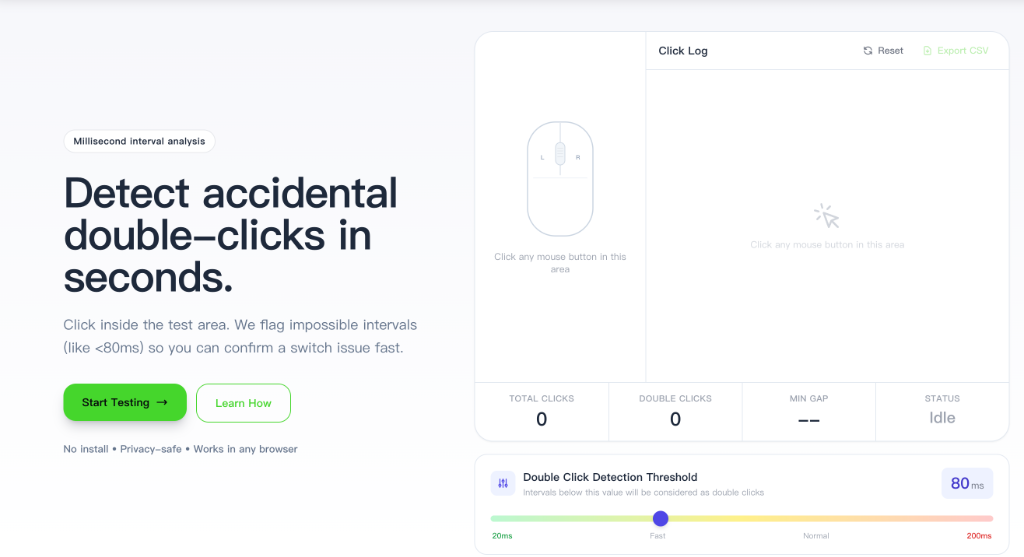 Open the test page and click any mouse button inside the click area 20–30 times. The tool supports left, right, middle, back, and forward buttons. You can adjust the detection threshold using the slider at the bottom — the default 80 ms works for most users.